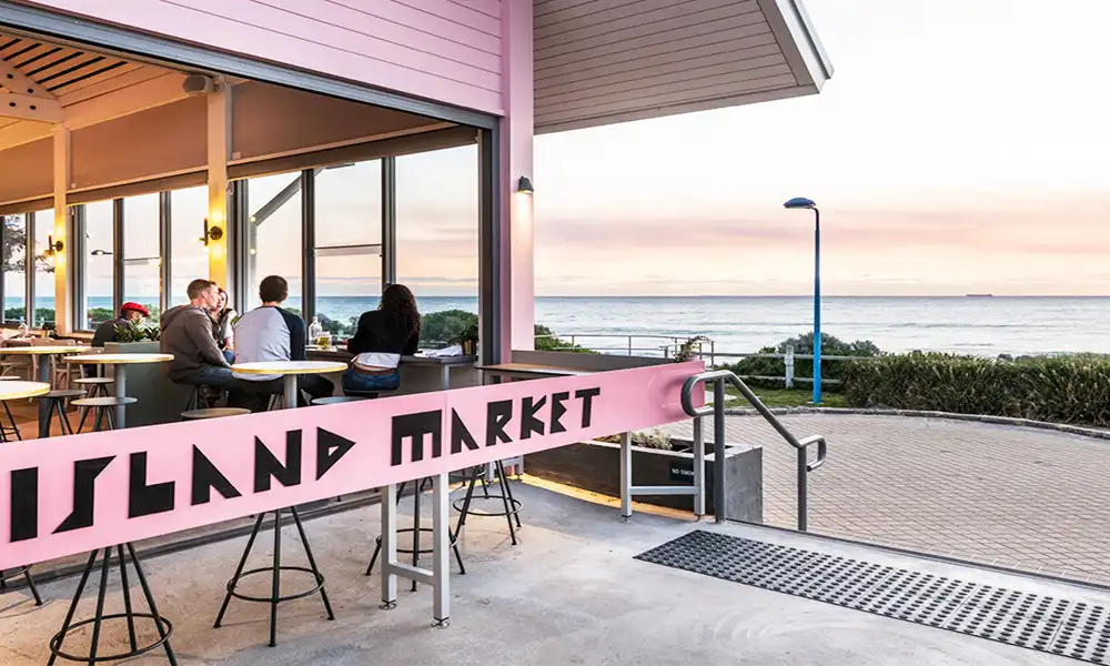 Island Market sits on the coast and offers a wonderful view of the oceanside. The interior radiates bright white and tender pink that’s supplemented by neon signs. This design choice might seem a bit over-the-top if you haven’t seen it. But all of the elements work well together.